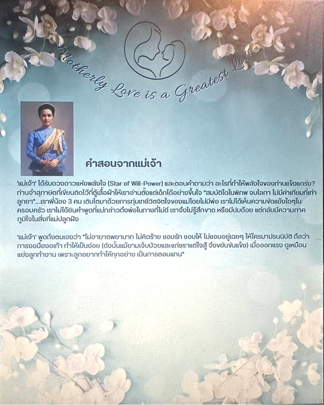 "แม่เจ้าเป็นแบบอย่างของแม่ผู้ให้ ที่เข้มแข็ง สอนให้ยืนหยัดด้วยตัวเอง และทำแต่สิ่งที่เป็นคุณประโยชน์" |
