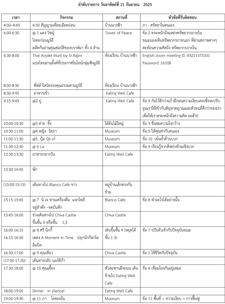 6.00 - 6.30 āļ. āļŦāļĨāļąāļāļāļēāļĢāļāļĩāđ 2 : āļāļĢāļ°āļŦāļāļąāļāļāļķāļāđāļŦāļĨāđāļāļāļĢāļąāļāļĒāļēāļāļĢāļ āļēāļĒāđāļ āđāļĢāļēāļĄāļąāļāļāļ°āļŦāļēāđāļŦāļāļļāļāļĨāļāļĩāđāļāļ°āļāđāļāđāļĨāļ°āļāļĨāđāļēāļ§āđāļāļĐāļĢāļ°āļāļāļ āļēāļĒāļāļāļ-āđāļĄāđāļ§āđāļēāļāļ°āđāļāđāļāļĻāļēāļŠāļāļē, āļāļēāļĢāđāļĄāļ·āļāļ, āļŦāļĢāļ·āļāļŠāļąāļāļāļĄ-āđāļĨāļ°āđāļāđāđāļāđāļāļāđāļāļāđāļēāļāļāļĒāđāļēāļāļŠāļ°āļāļ§āļāļŠāļāļēāļĒāļŠāļģāļŦāļĢāļąāļāļāļ§āļēāļĄāđāļāļ·āđāļāļĒāļāļē, āļāļ§āļēāļĄāļŦāļāļļāļāļŦāļāļīāļ, āđāļĨāļ°āļāļ§āļēāļĄāļāļīāļāđāļāļīāļāļĨāļāļāļāļāđāļĢāļēāđāļāļ āļĢāļ°āļāļāļ āļēāļĒāļāļāļāļāļąāđāļāļŦāļĄāļāļĨāđāļ§āļāļĄāļĩāļāđāļāļāļģāđāļāļīāļāļĄāļēāļāļēāļāļĄāļāļļāļĐāļĒāđ āļāļąāļāļāļąāđāļāļāļķāļāļŦāļĨāļĩāļāđāļĨāļĩāđāļĒāļāđāļĄāđāđāļāđāļāļĩāđāļāļ°āļĄāļĩāļāđāļāļāļāļāļĢāđāļāļāļāļĒāļđāđāļāđāļēāļ āđāļĄāđāļ§āđāļēāļāļ°āļāļđāļāļŠāļĢāđāļēāļāļāļķāđāļāļāđāļ§āļĒāđāļāļāļāļēāļāļĩāđāļāļĩāļāļĩāđāļŠāļļāļāļāđāļāļēāļĄ āļāļĒāđāļēāļāđāļĢāļāđāļāļēāļĄ āļāđāļāļĒāļāļĢāļąāđāļāļāļĩāđāļāļąāļ§āļāļąāļāļŦāļēāđāļāļāđāļĄāđāđāļāđāļāļąāļāļŦāļē āļāļąāļāļŦāļēāļāļ·āļāļ§āļīāļāļĩāļāļĩāđāđāļĢāļēāļāļīāļāđāļĨāļ°āļĢāļąāļāļĄāļ·āļāļāļąāļāļāļĪāļāļīāļāļĢāļĢāļĄāļāļĩāđāļĒāļēāļāļĨāļģāļāļēāļāļŦāļĢāļ·āļāļāļēāļĢāļāļĢāļ°āļāļģāļāļĩāđāđāļāđāļāļāļąāļāļāļĢāļēāļĒ āđāļĢāļēāļĄāļļāđāļāļāļ§āļēāļĄāļŠāļāđāļāđāļāļāļĩāđāļāļąāļāļŦāļēāļĄāļēāļāđāļāļīāļāđāļ āļāļāļĄāļĩāļāļēāļĢāļāļĒāļēāļĒāđāļŦāļāđāļāļķāđāļāđāļāđāļāđāļĨāļ°āļāļąāļāļāļāļēāļāļēāļĢāđāļĢāļēāđāļ§āđāļāļąāļāļāļ§āļēāļĄāļāļīāļāđāļāļīāļāļĨāļ, āļāļ§āļēāļĄāđāļĢāđāļŠāļēāļĢāļ°, āđāļĨāļ°āđāļĢāļ·āđāļāļāđāļĨāđāļāļāđāļāļĒ āļāļēāļĢāļāļąāļāļāļāļēāļāļēāļĢāļāļĩāđāļāļąāļāļāļ§āļēāļāļāļ§āļēāļĄāđāļāđāļēāđāļāļāļĩāđāļāļąāļāđāļāļ: āđāļĢāļēāļĄāļļāđāļāļāļ§āļēāļĄāļŠāļāđāļāđāļāļāļĩāđāļŠāļīāđāļāļāļĩāđāļāļīāļāļĄāļēāļāļāļāđāļĢāļēāļĄāļāļāđāļĄāđāđāļŦāđāļāļŠāļīāđāļāļāļĩāđāļāļąāļāđāļāļāļāļĒāļđāđāđāļĨāđāļ§ āđāļĄāļ·āđāļāđāļĢāļēāļāļķāļāļāļāļāļ§āļēāļĄāđāļāļĩāļĒāļāļŠāļāļ āđāļĢāļēāļāļ°āđāļĄāđāļĄāļļāđāļāļāļ§āļēāļĄāļŠāļāđāļāđāļāļāļĩāđāļāļąāļāļŦāļē āđāļāđāļāļ°āļŠāļĢāđāļēāļāļāļ·āđāļāļāļĩāđāļāļĒāđāļēāļāļĄāļĩāļŠāļāļīāļŠāļģāļŦāļĢāļąāļāļāļēāļāđāļĨāļ·āļāļāđāļĨāļ°āļ§āļīāļāļĩāđāļāđāđāļāđāļāļ āđāļāļĒāļāļēāļĢāļāļĢāļ°āļŦāļāļąāļāđāļĨāļ°āđāļāđāļāļĢāļąāļāļĒāļēāļāļĢāļ āļēāļĒāđāļāļāļāļāđāļĢāļē āđāļĢāļēāļāļ°āļāļāļāļēāļāđāļĨāļ·āļāļāđāļāļīāļāļāļ§āļāļŠāļģāļŦāļĢāļąāļāļāļ§āļēāļĄāļāļīāļāđāļāļīāļāļĨāļāļāļĩāđāļĢāļļāļāđāļĢāļāļāļĩāđāļāļĒāļđāđāļĢāļāļāļāļąāļ§āđāļĢāļē (āļāļĨāļīāļāļāđāļēāļāļāđāļ) āļāļīāļāļāļĢāļĢāļĄ : āļāļāļ°āļāļĩāđāļĢāđāļ§āļĄāļāļąāļāļāļĒāļđāđāđāļāļāļ§āļēāļĄāđāļāļĩāļĒāļāļŠāļāļ āļ Tower of Peace āļāļĩāđāđāļāļ/āļāļĩāđāļ§āļīāļāļāđ āļāļĨāļąāļāļāļąāļāļāđāļēāļāļāļļāļāļŠāļĄāļāļąāļāļīāļāļąāđāļ 4 āļāđāļēāļ āļāļāļāļāđāļāļāļĢāļēāļŦāđāļĄāļē