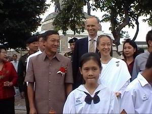ทางซ้ายนักเรียนร้องเพลงเปิดรายการ ทางขวา พลตรีจำลอง ศรีเมือง