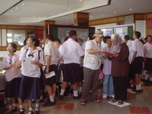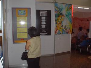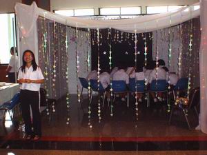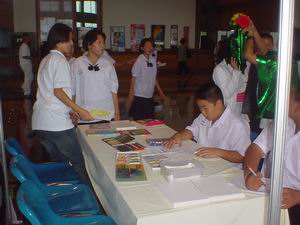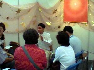 ด้านซ้ายเป็นนิทรรศการแนะนำบราห์มา กุมารี และทางขวาเป็นกิจกรรมในหอประชุมนักเรียนกำลังสั่นระฆังแห่งสันติ